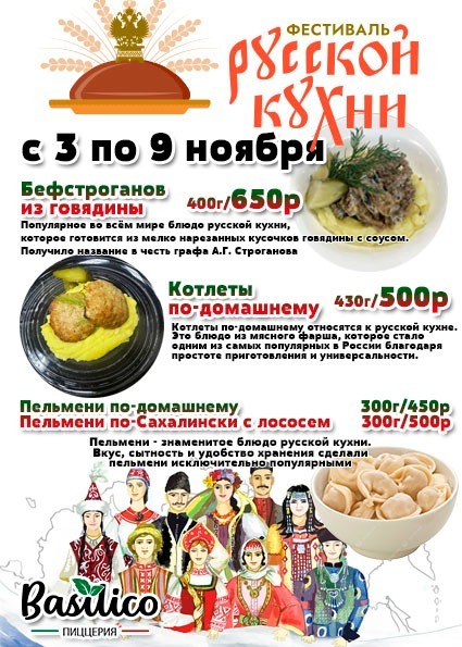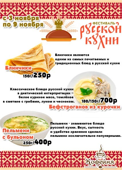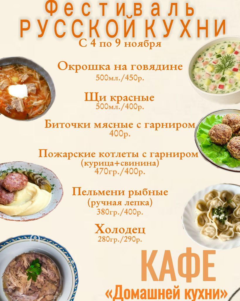 Вкус русской кухни можно будет оценить в нескольких точках посёлка с 3 по 9 ноября:
