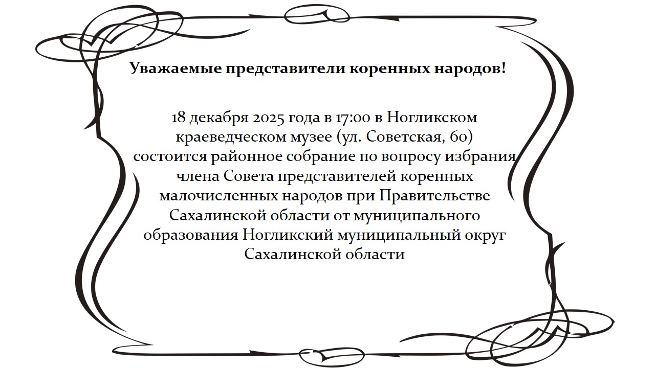 18.12.2025 года в 17:00 в Ногликском краеведческом музее состоится районное собрание коренных малочисленных народов Севера, проживающих на территории муниципального образования.